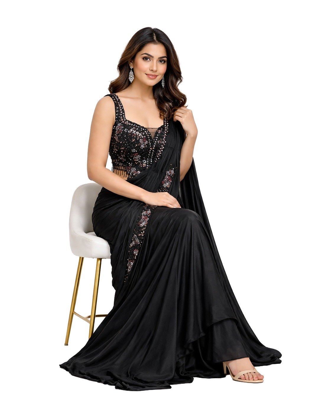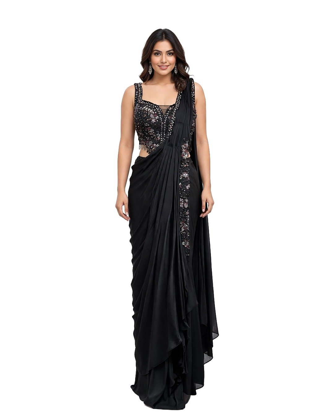 Black outfit featuring pulse and sequins work, delivering bold shimmer, sleek elegance, contemporary flair, and a striking, glamorous evening-ready statement look.
