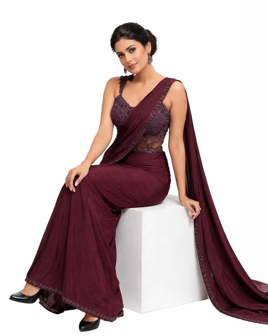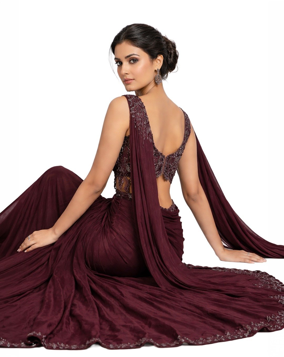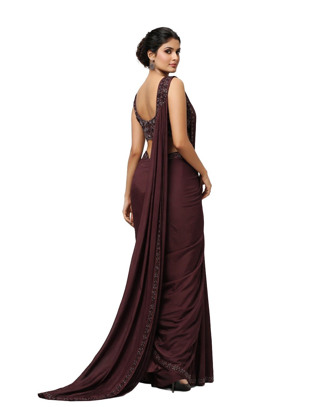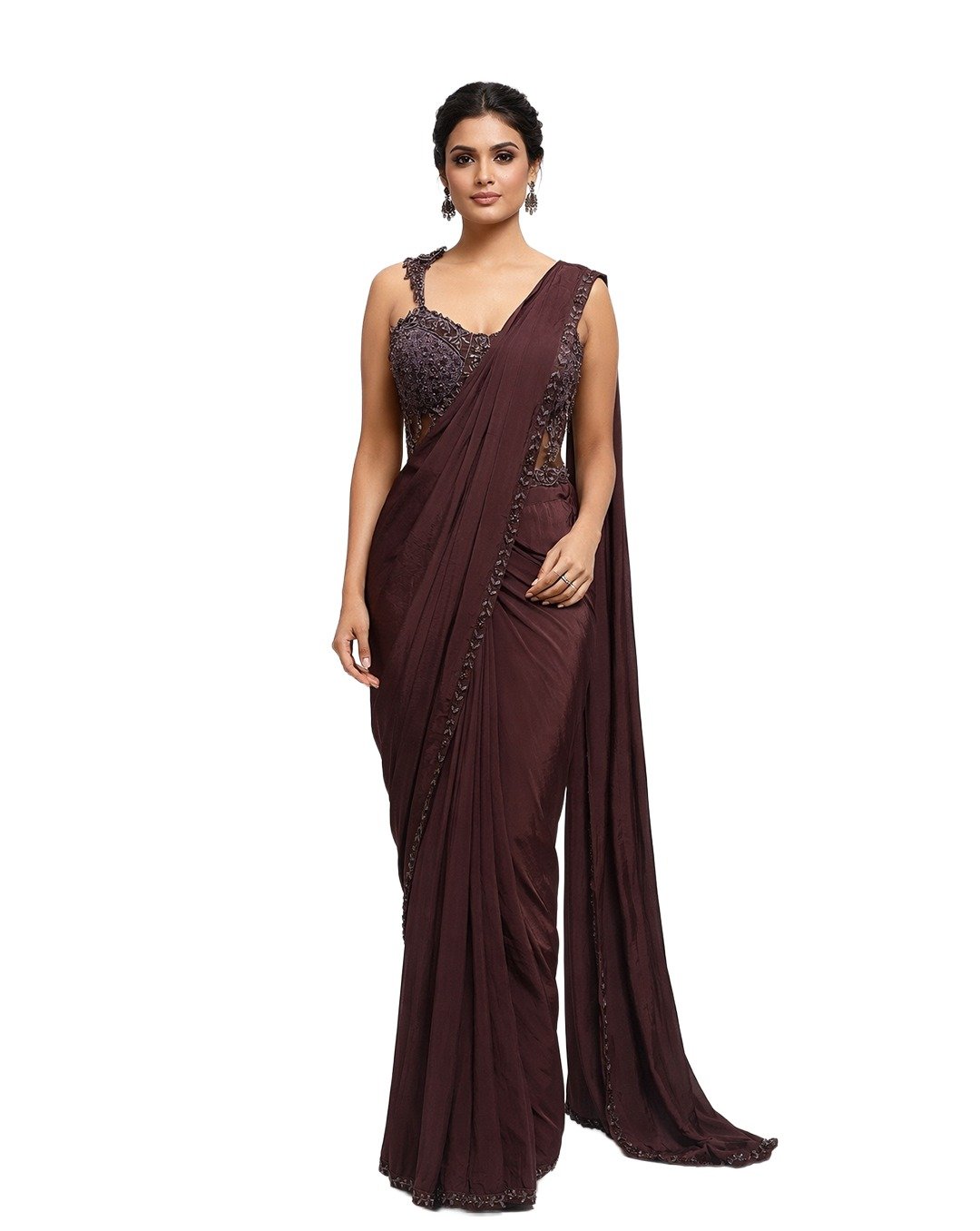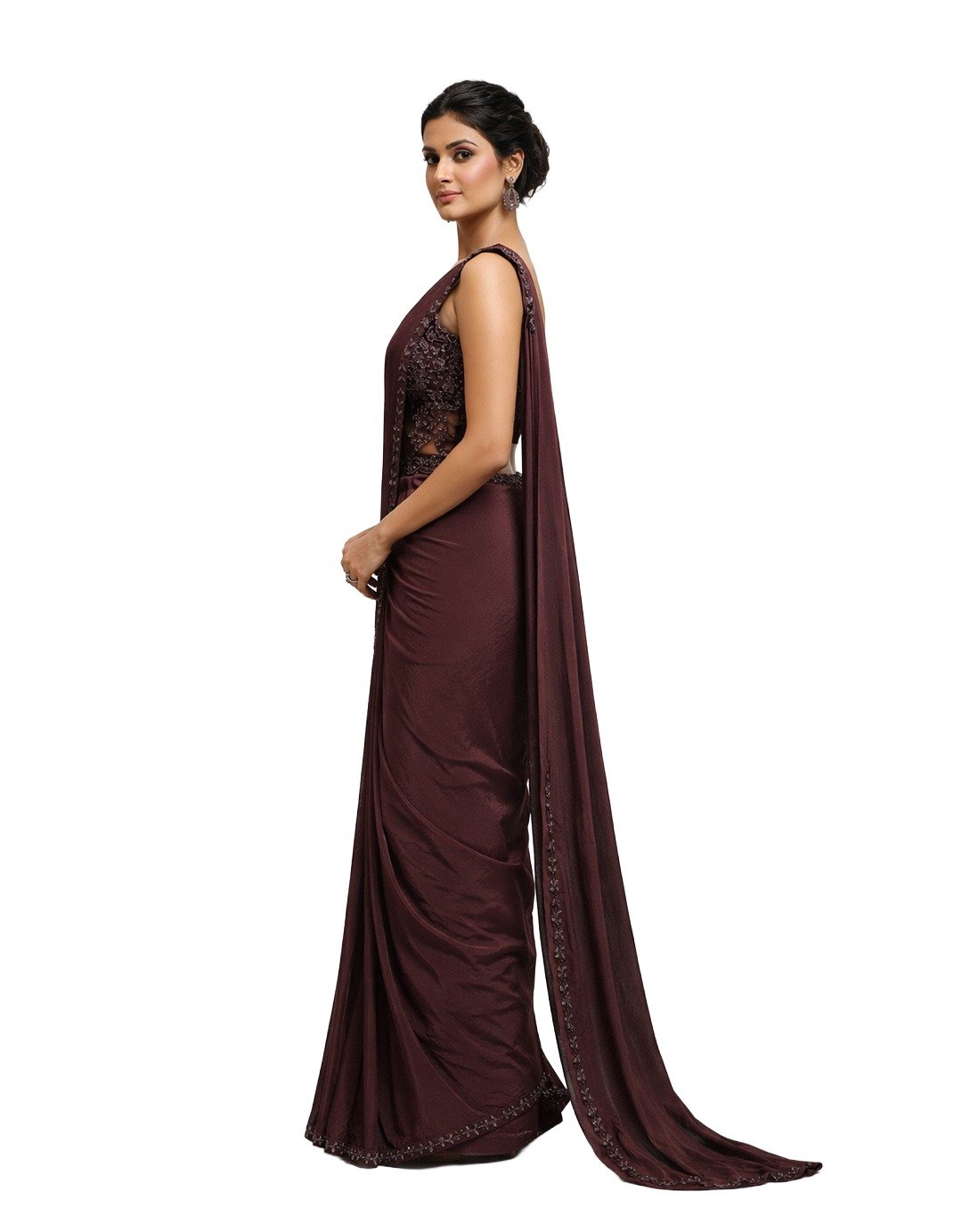 Brown outfit featuring Naksi and pearl work, showcasing rich texture, intricate detailing, elegant craftsmanship, and a refined, sophisticated festive statement look.