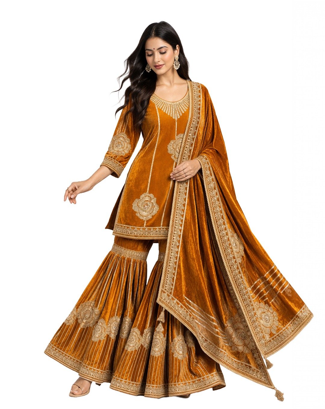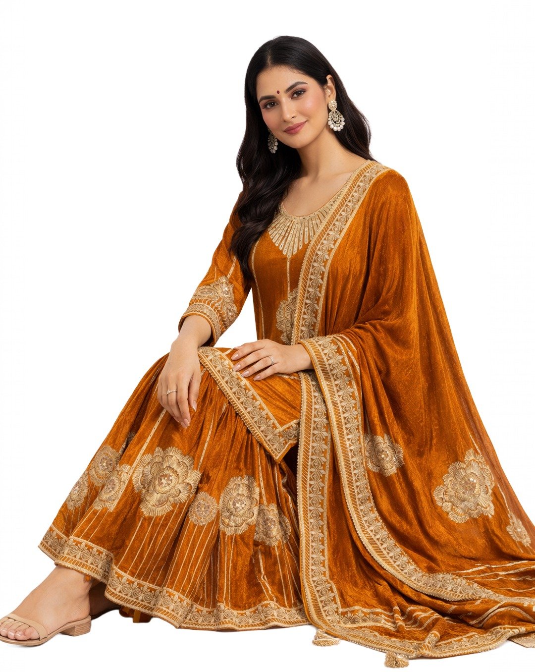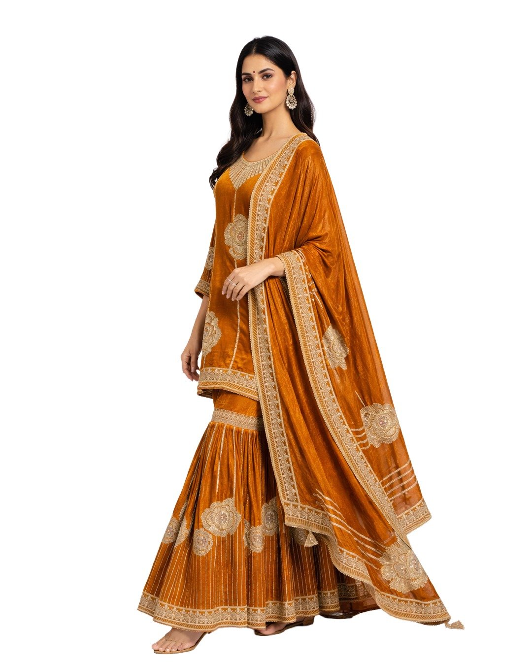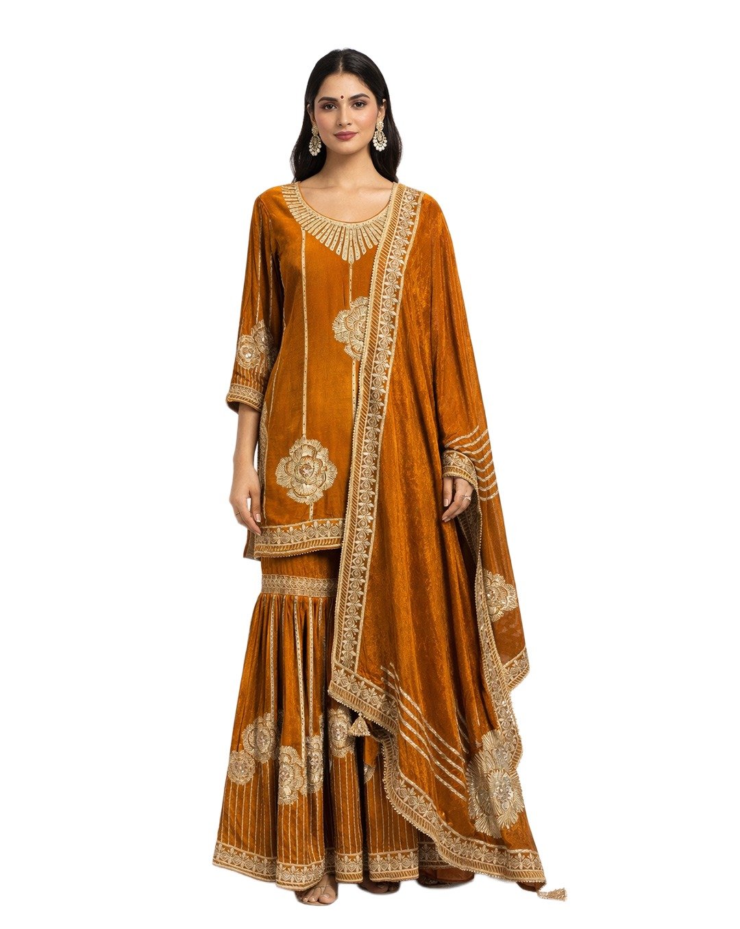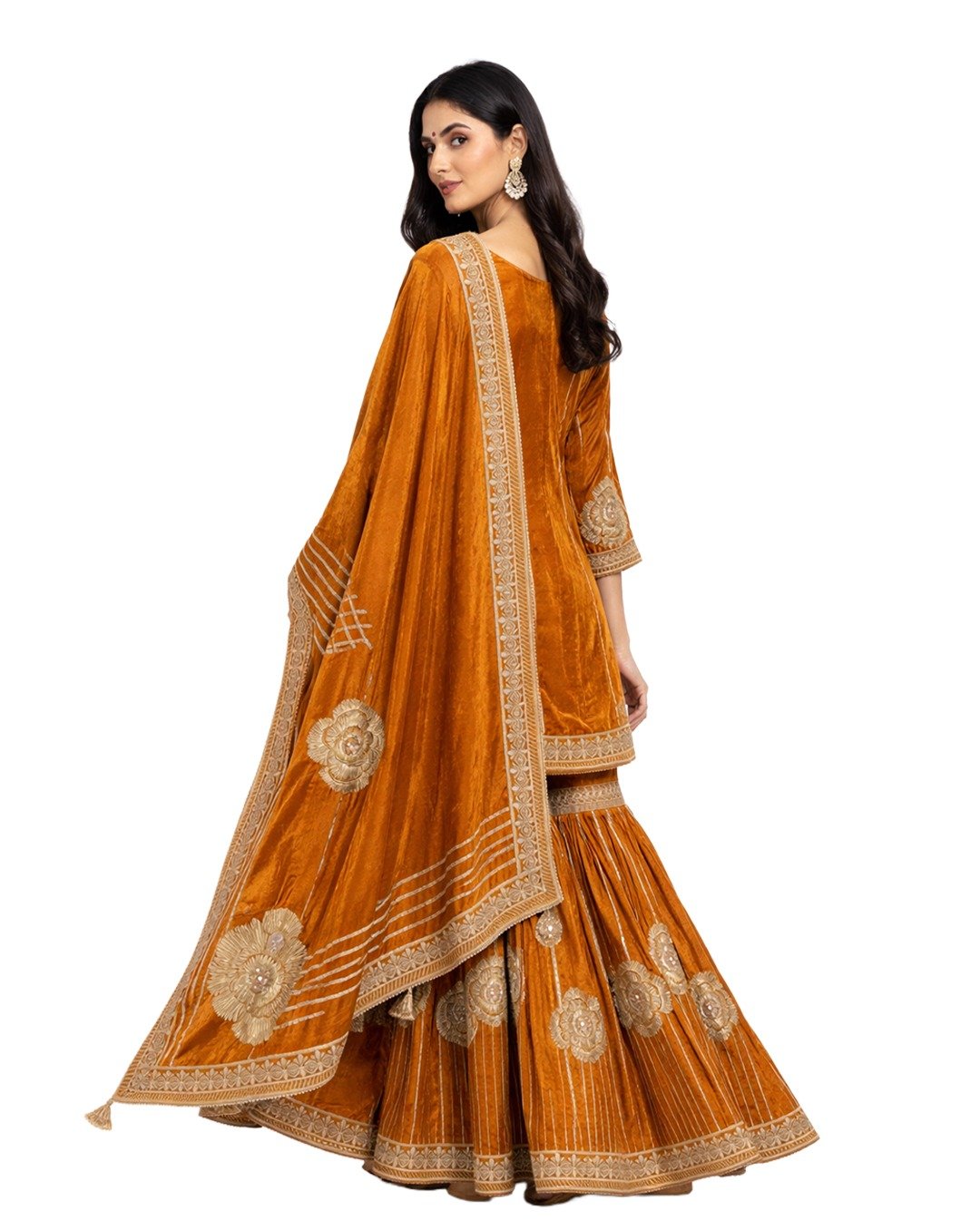 Brown rest (blouse/back piece) beautifully showcases traditional Goota, Zari, and Aari work, featuring intricate patterns, rich texture, and elegant craftsmanship for a classic ethnic look.