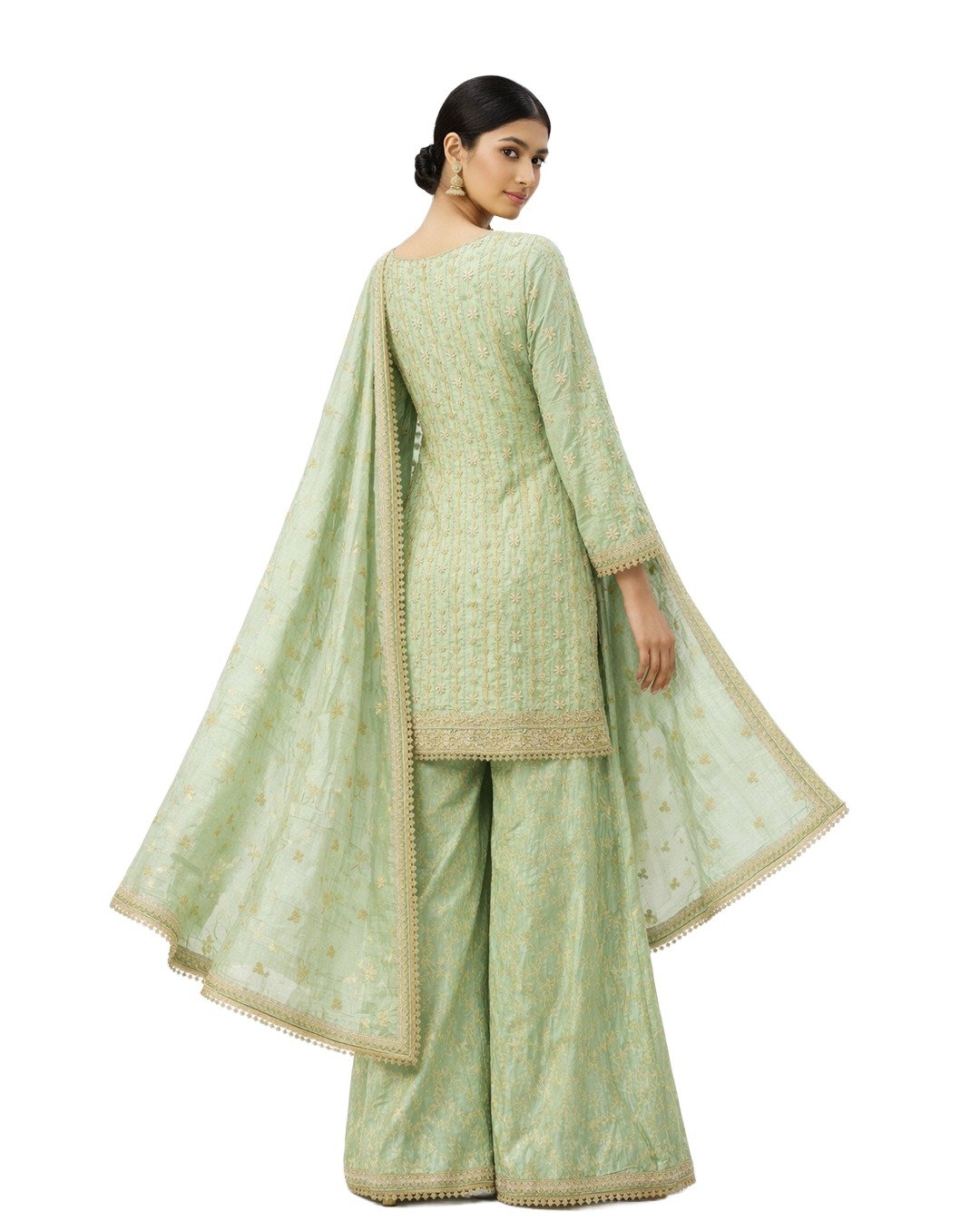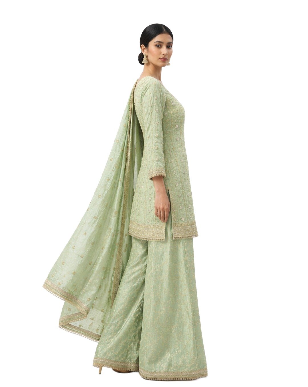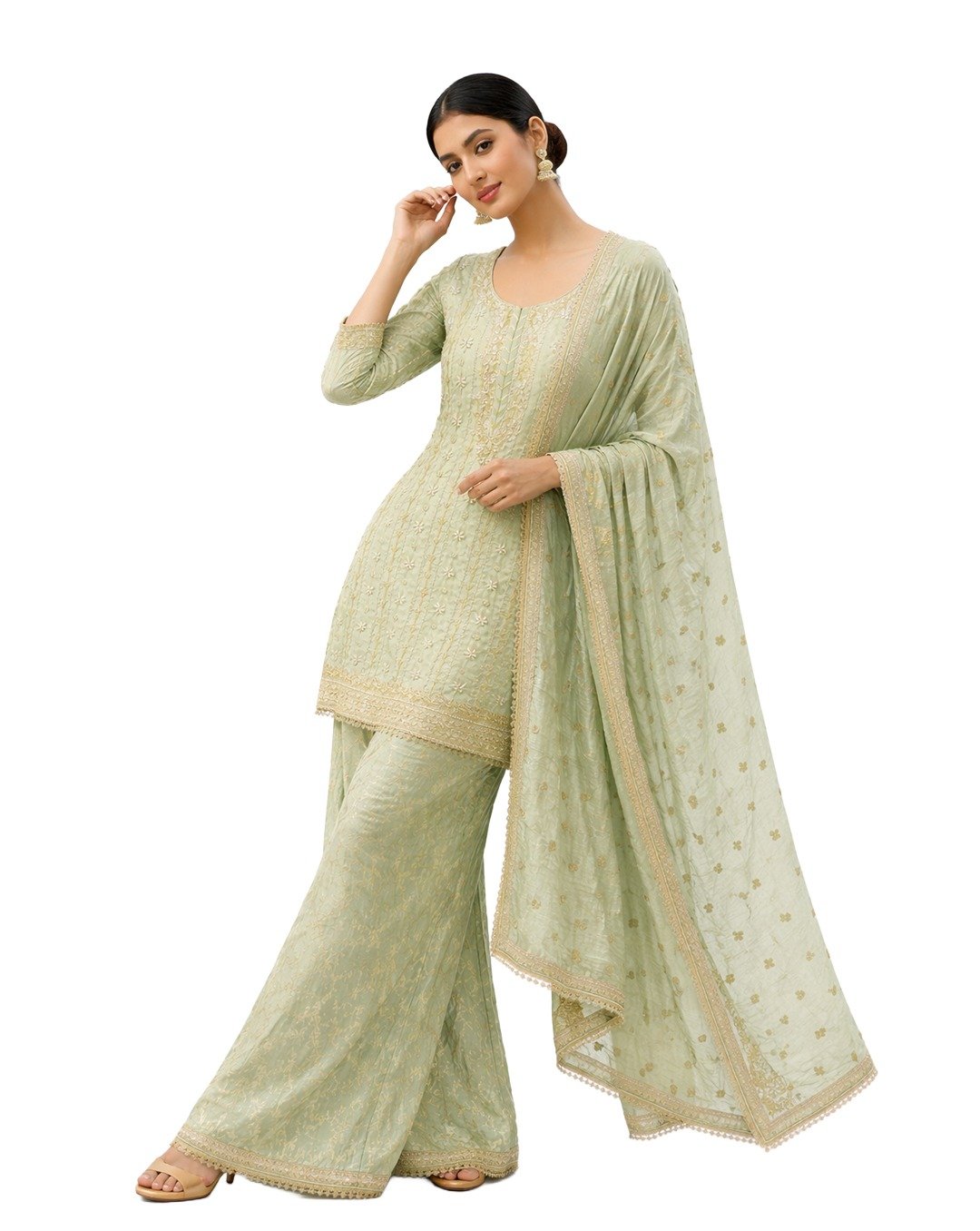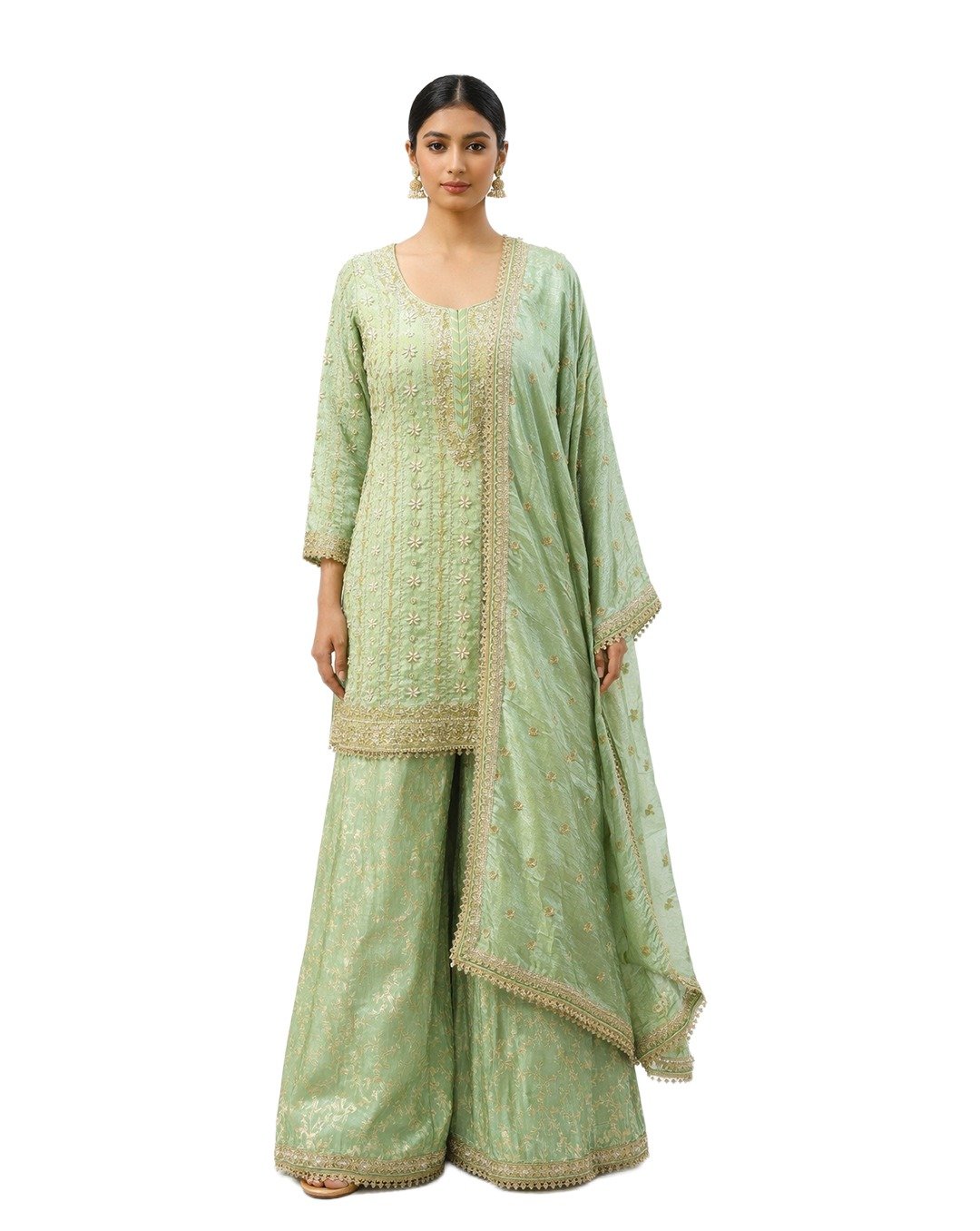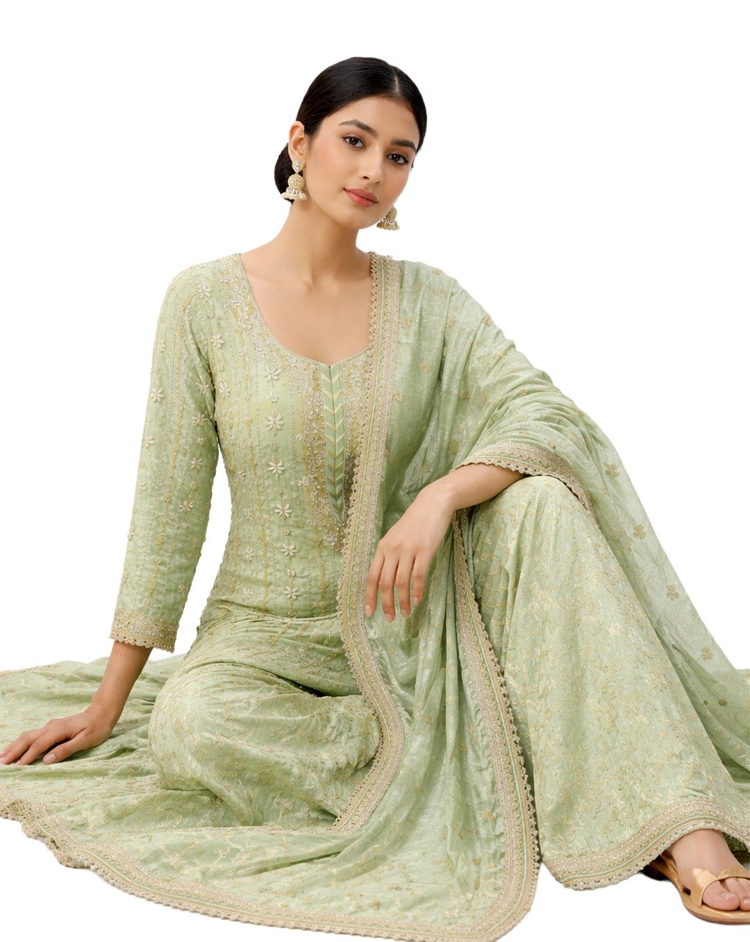 Green outfit adorned with gotta, patti, cutglasses, and pulse work, showcasing traditional elegance with intricate detailing, perfect for festive and wedding occasions.