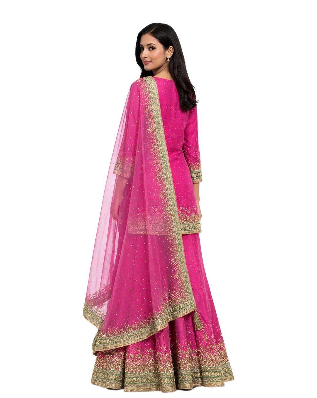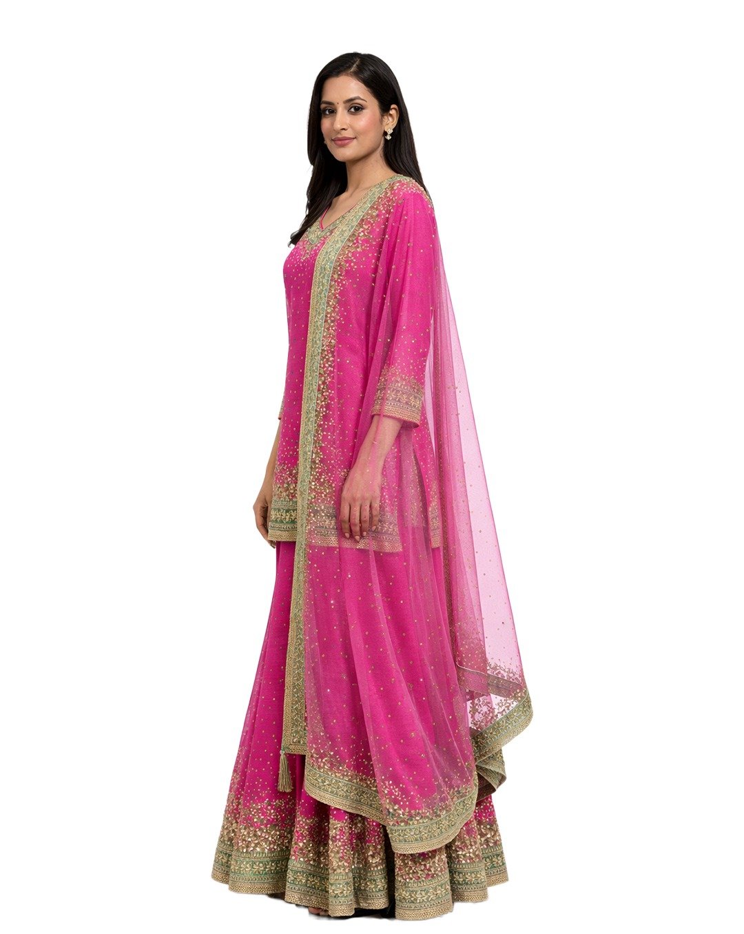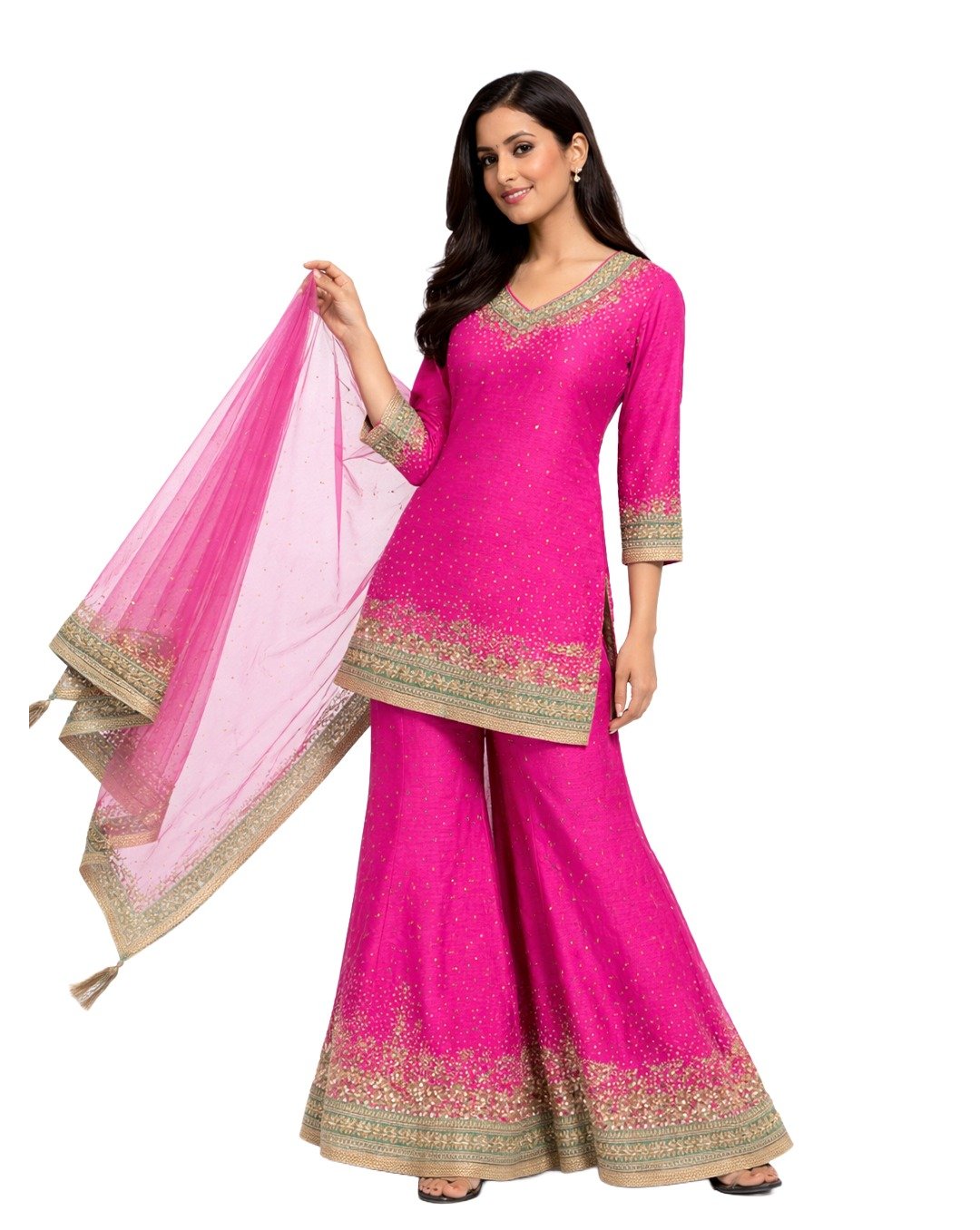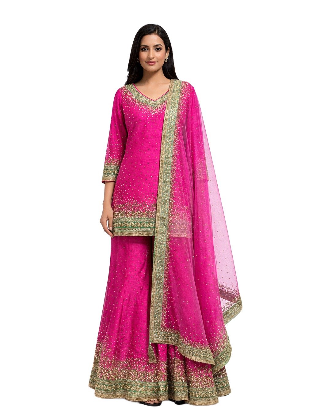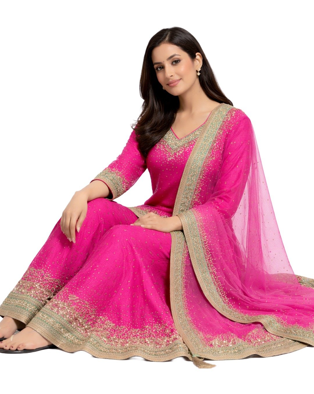 Hot pink outfit featuring intricate sequins and zari work, perfect for weddings and festive occasions, adding glamour, elegance, and vibrant charm.