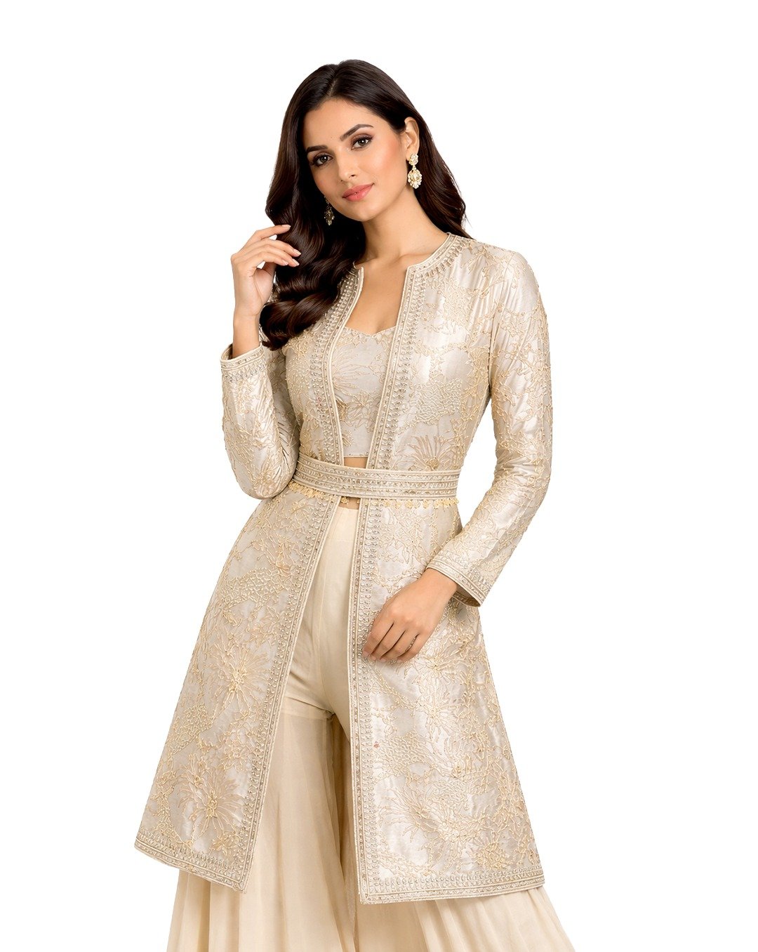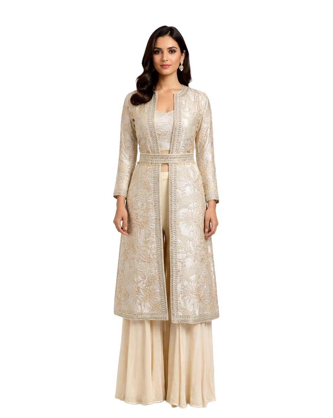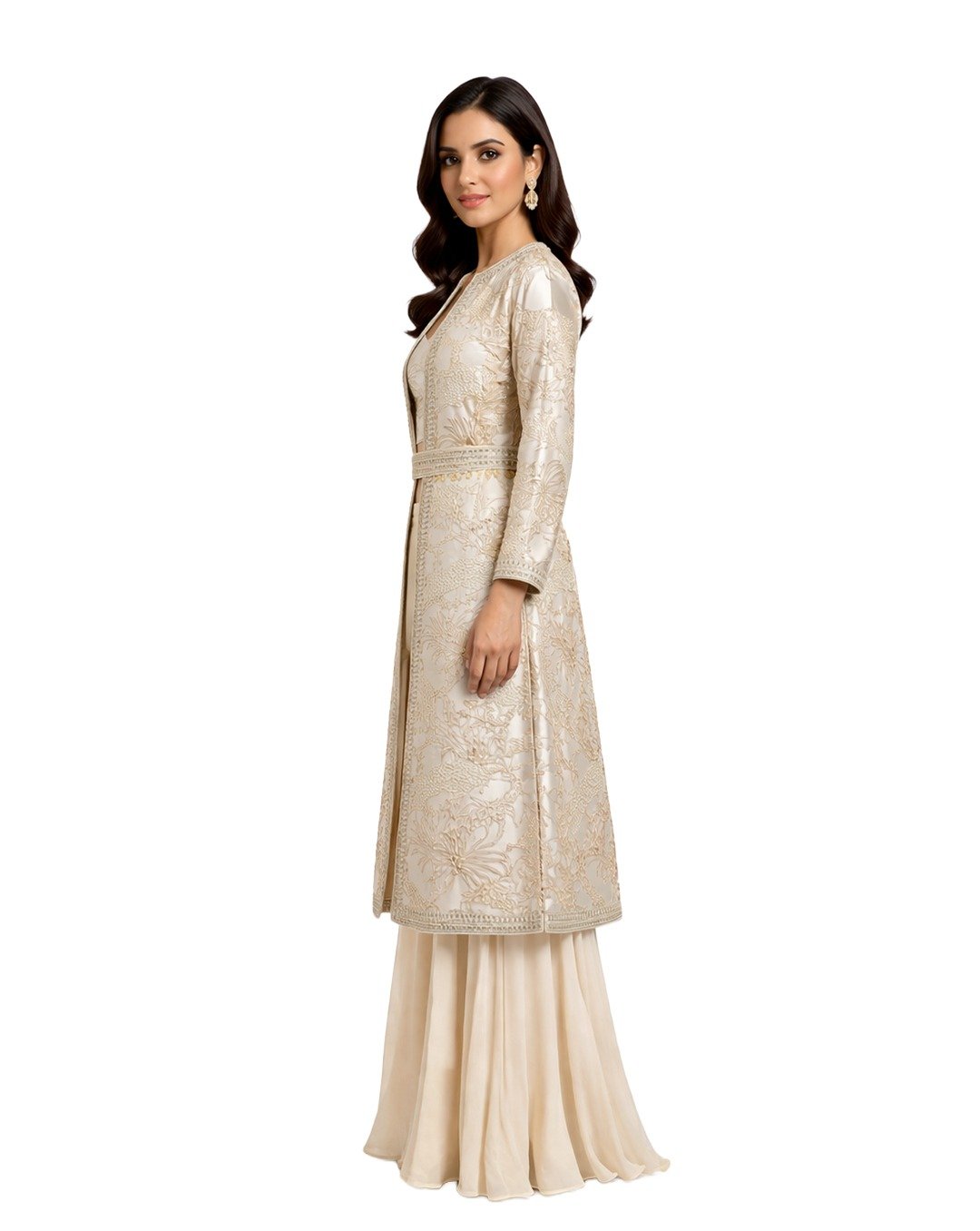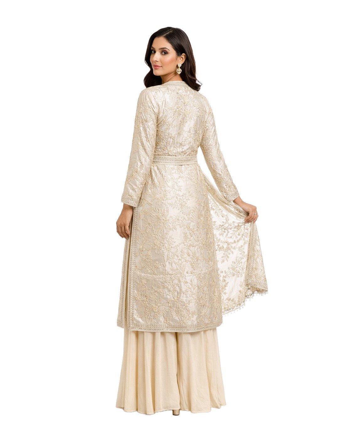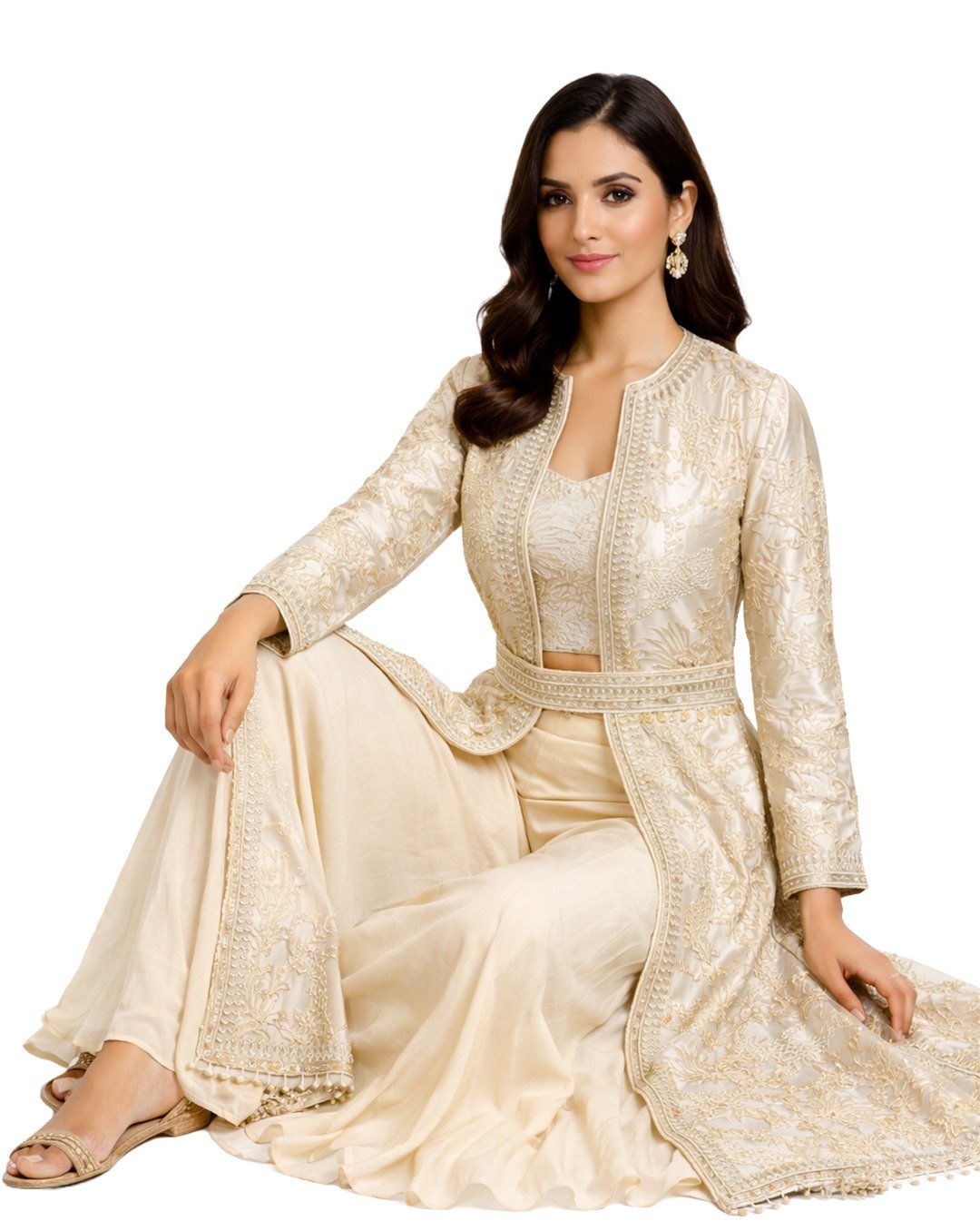 Ivory outfit adorned with mirror, pulse, and Aari work, offering intricate craftsmanship, soft elegance, and a graceful, contemporary traditional appeal.