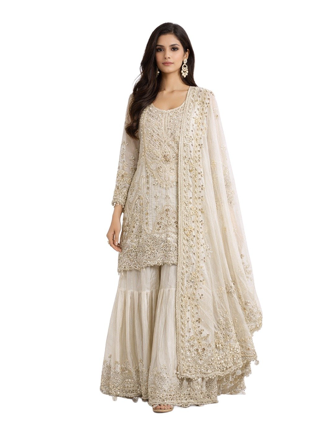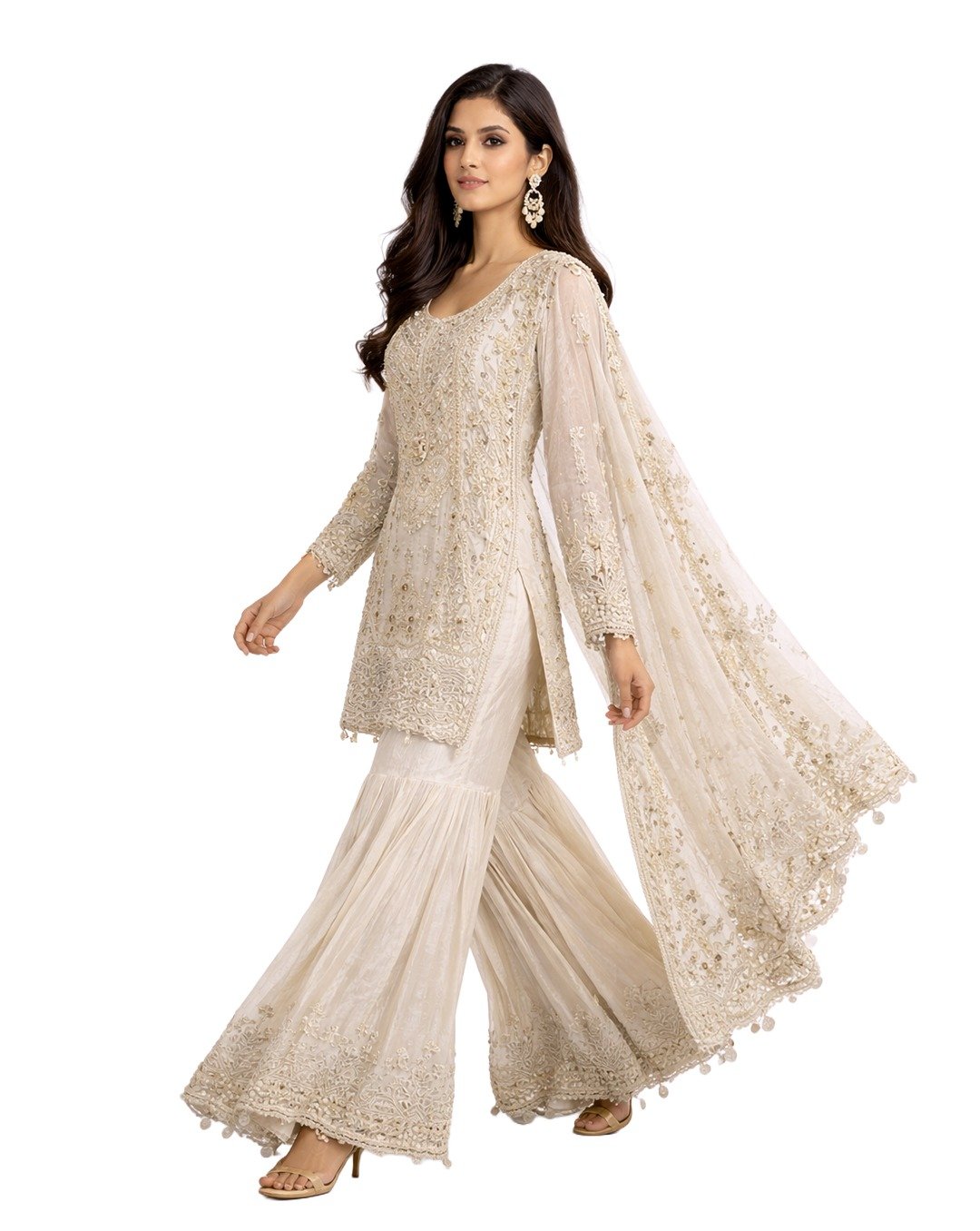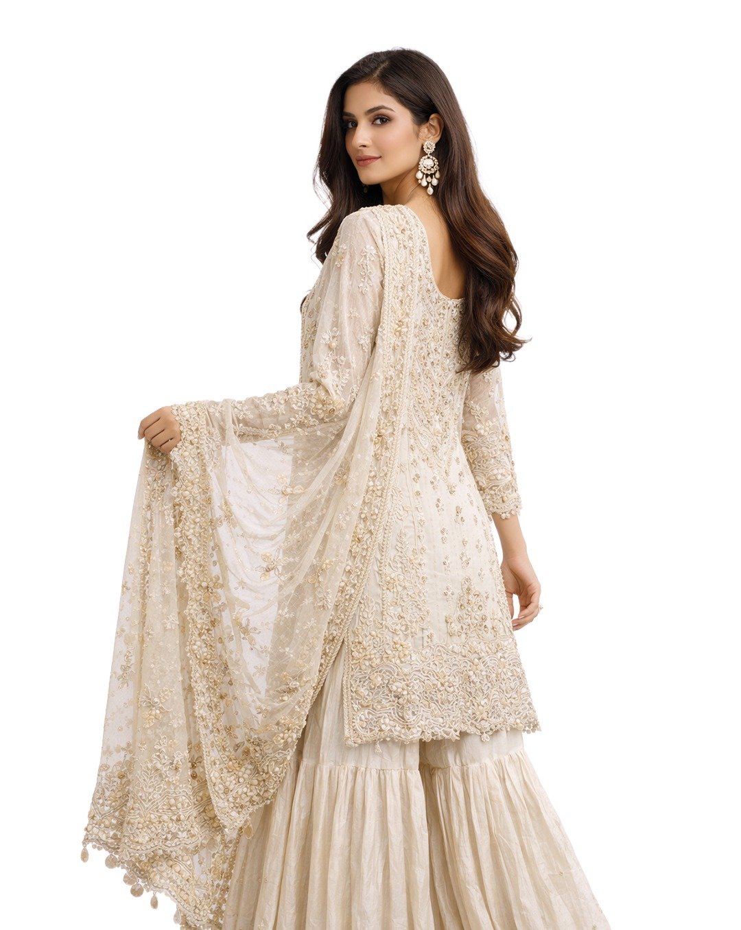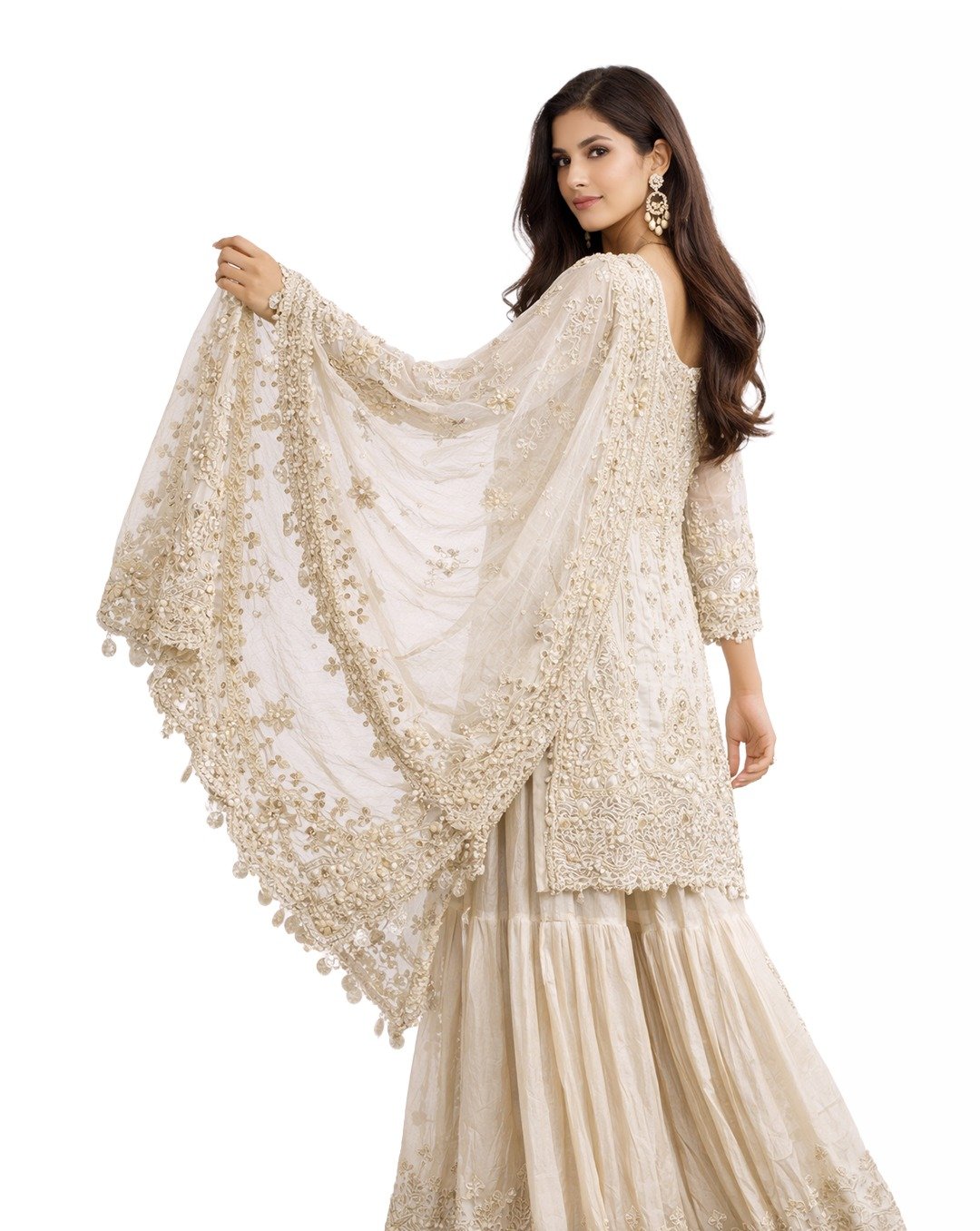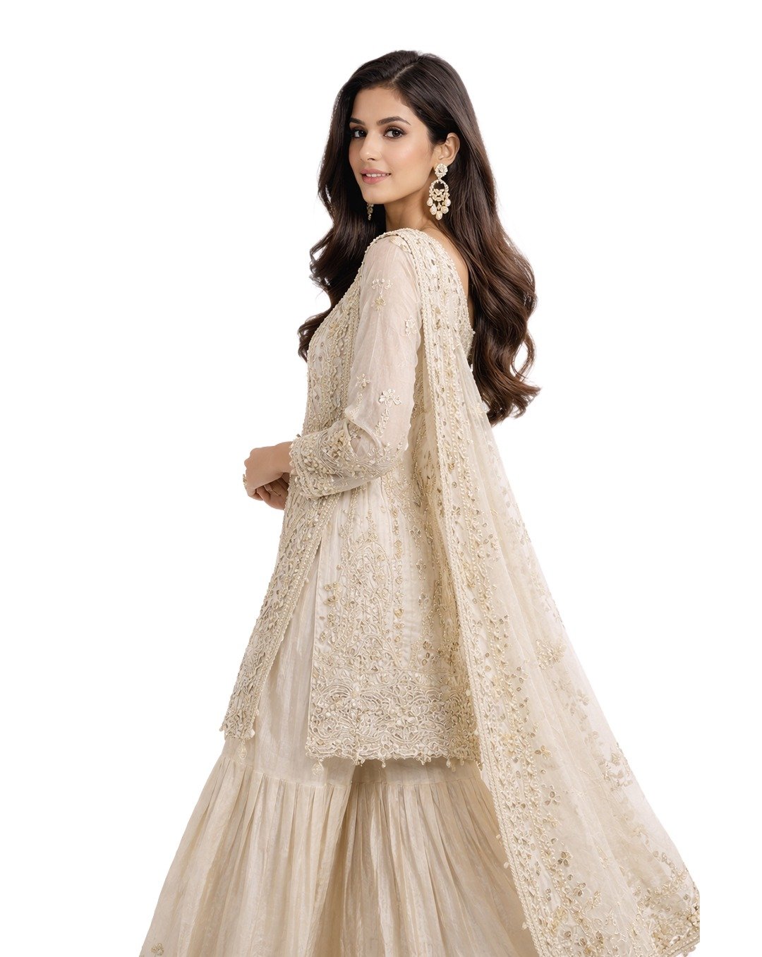 Ivory gold fabric adorned with elegant Gotta Patti work, featuring intricate patterns, traditional charm, and graceful detailing, perfect for festive and ethnic wear.