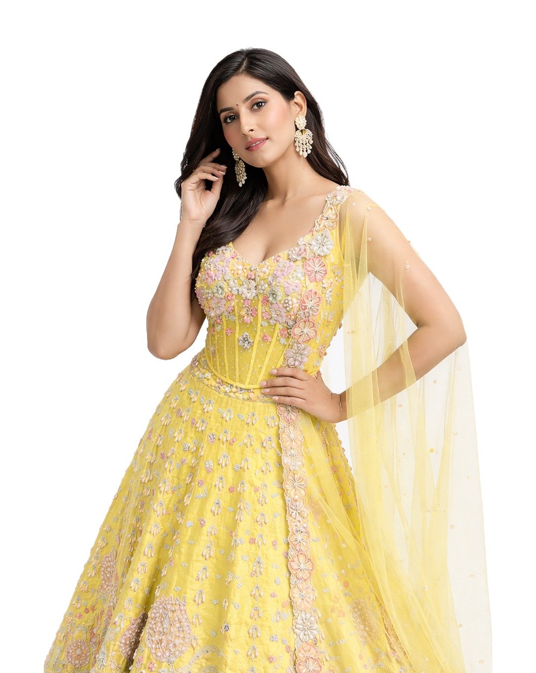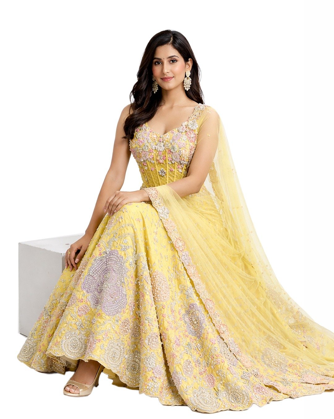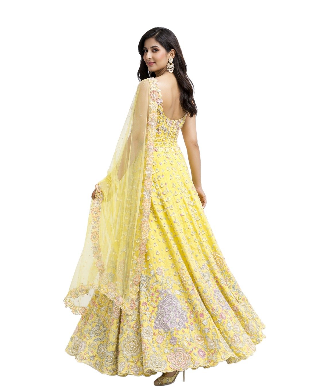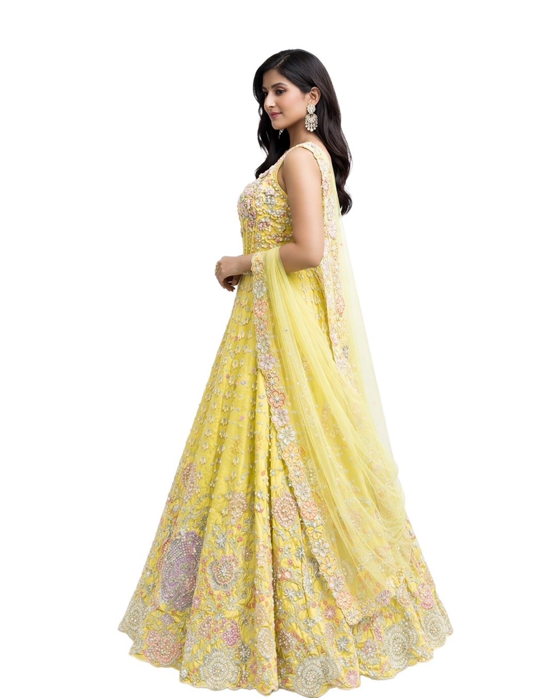 Lemon green outfit featuring pulse, sequins, and zari work, radiating fresh vibrance, intricate shimmer, festive charm, and a graceful contemporary statement look.