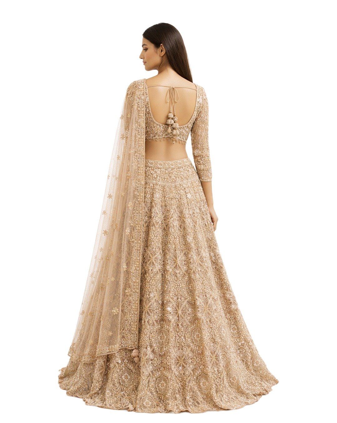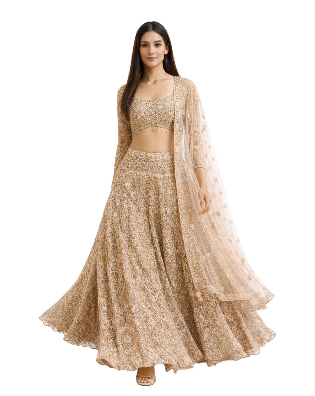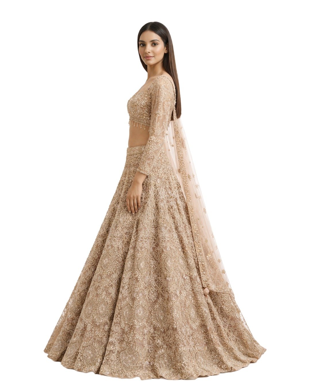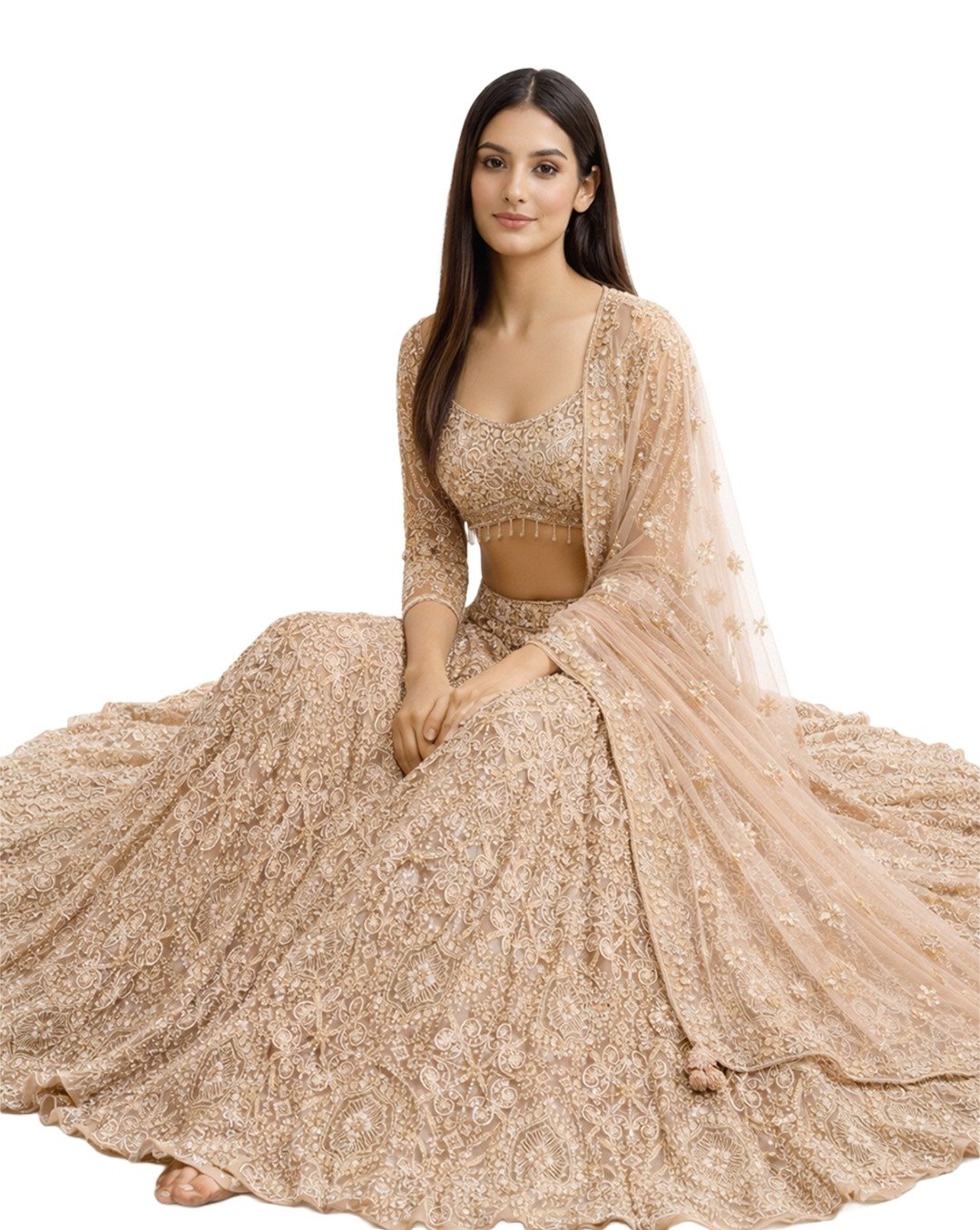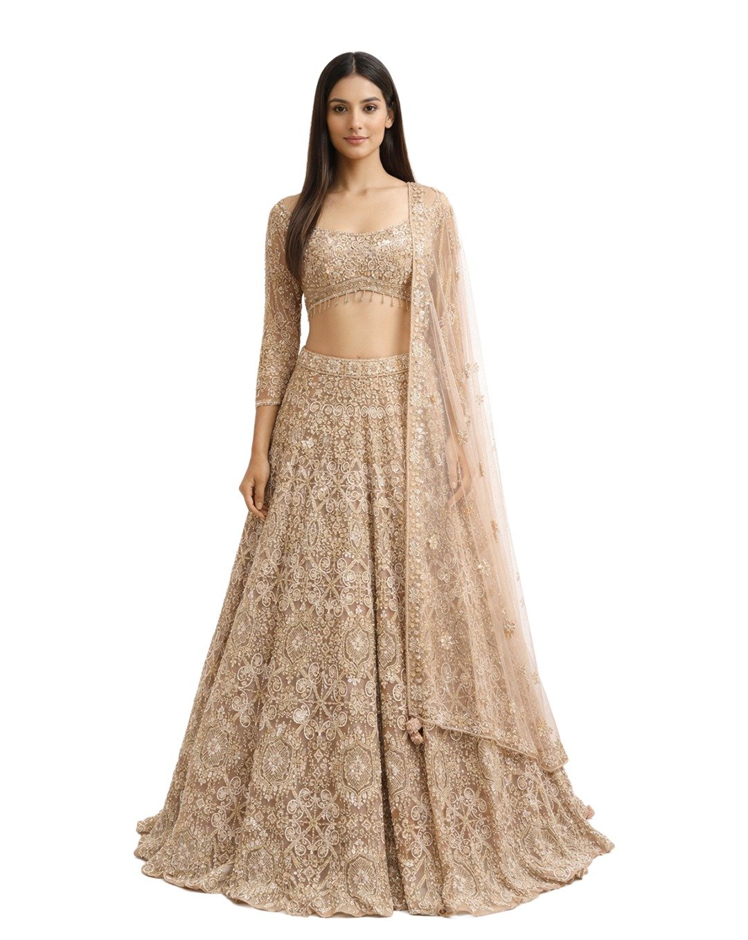 Lite peach outfit featuring intricate kundan work, shimmering sequins, elegant pulse detailing, and sparkling cutglass embellishments for a graceful festive look.
