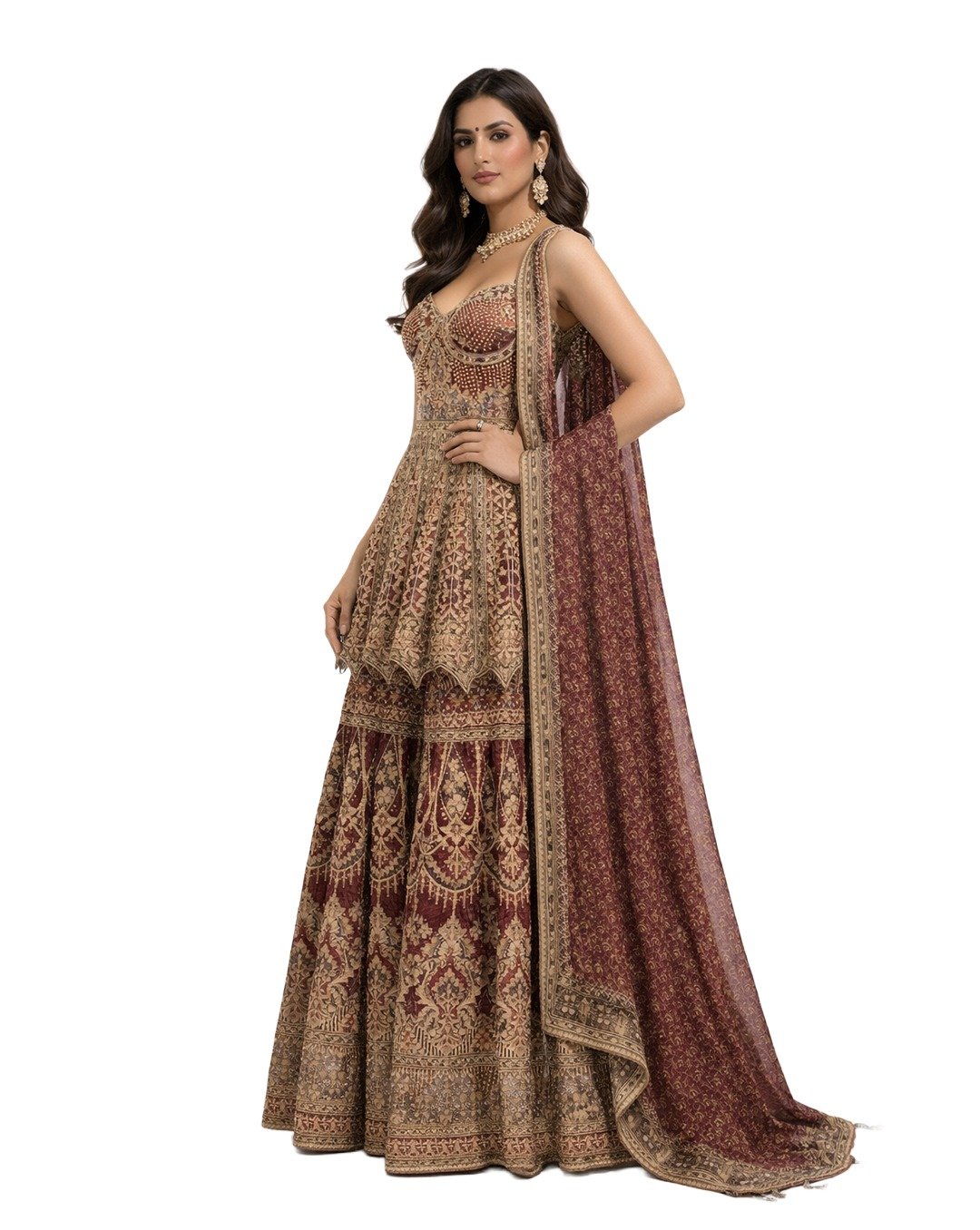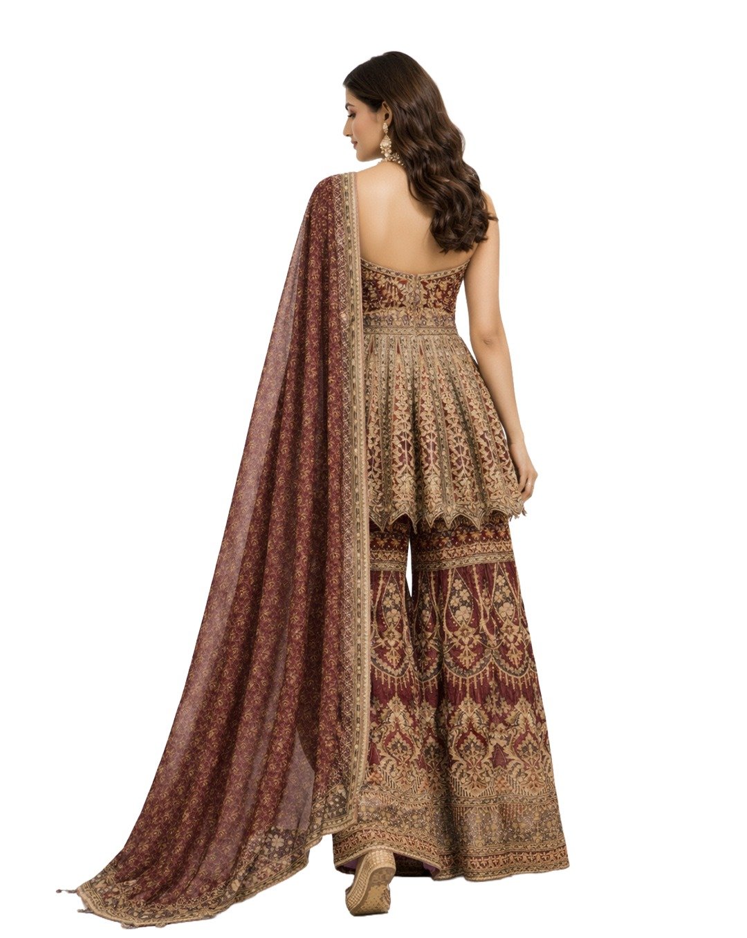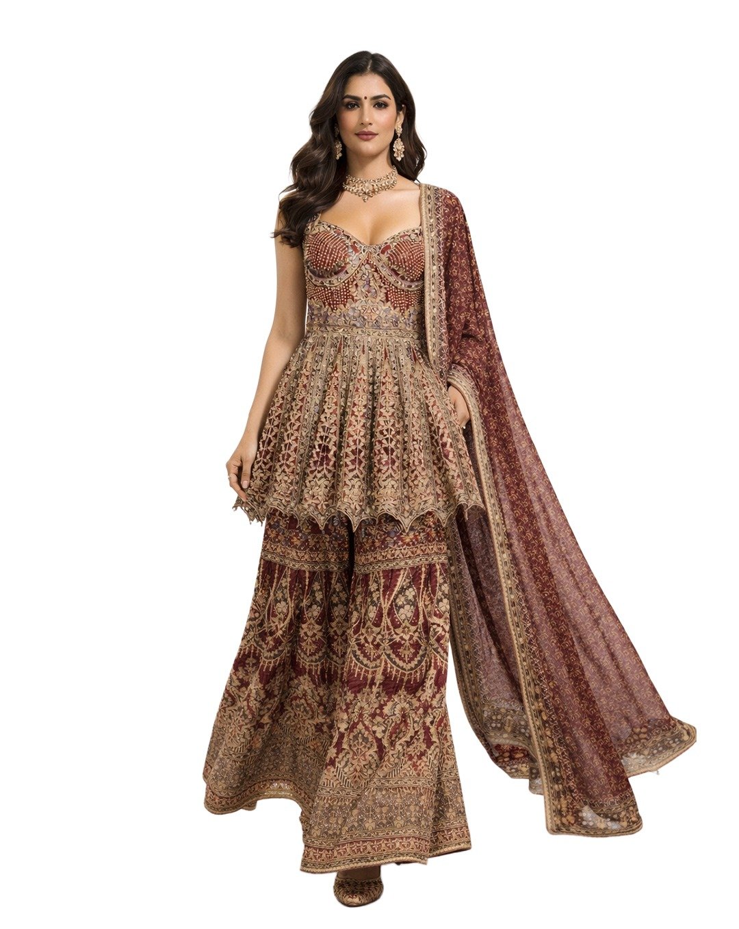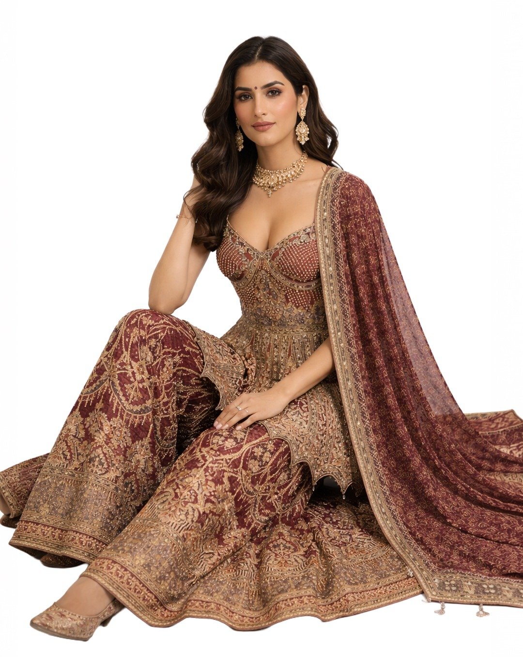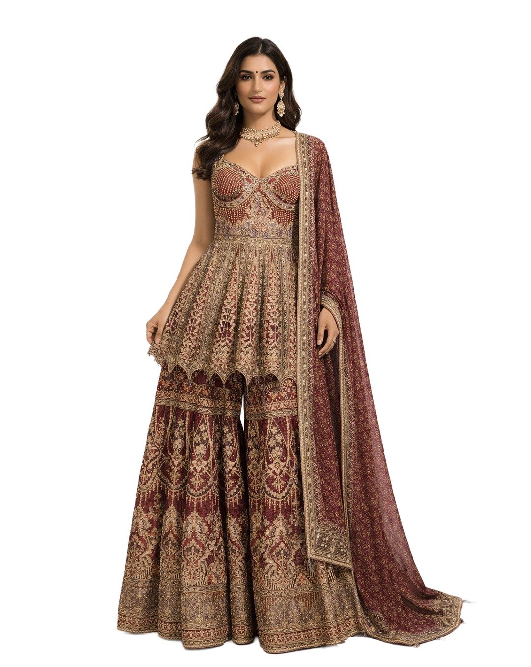 Elegant mehroon garara set with intricate gotta, aari and zari work, perfect for weddings, festive occasions, rich traditional look.