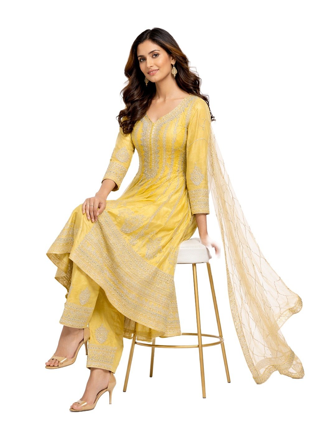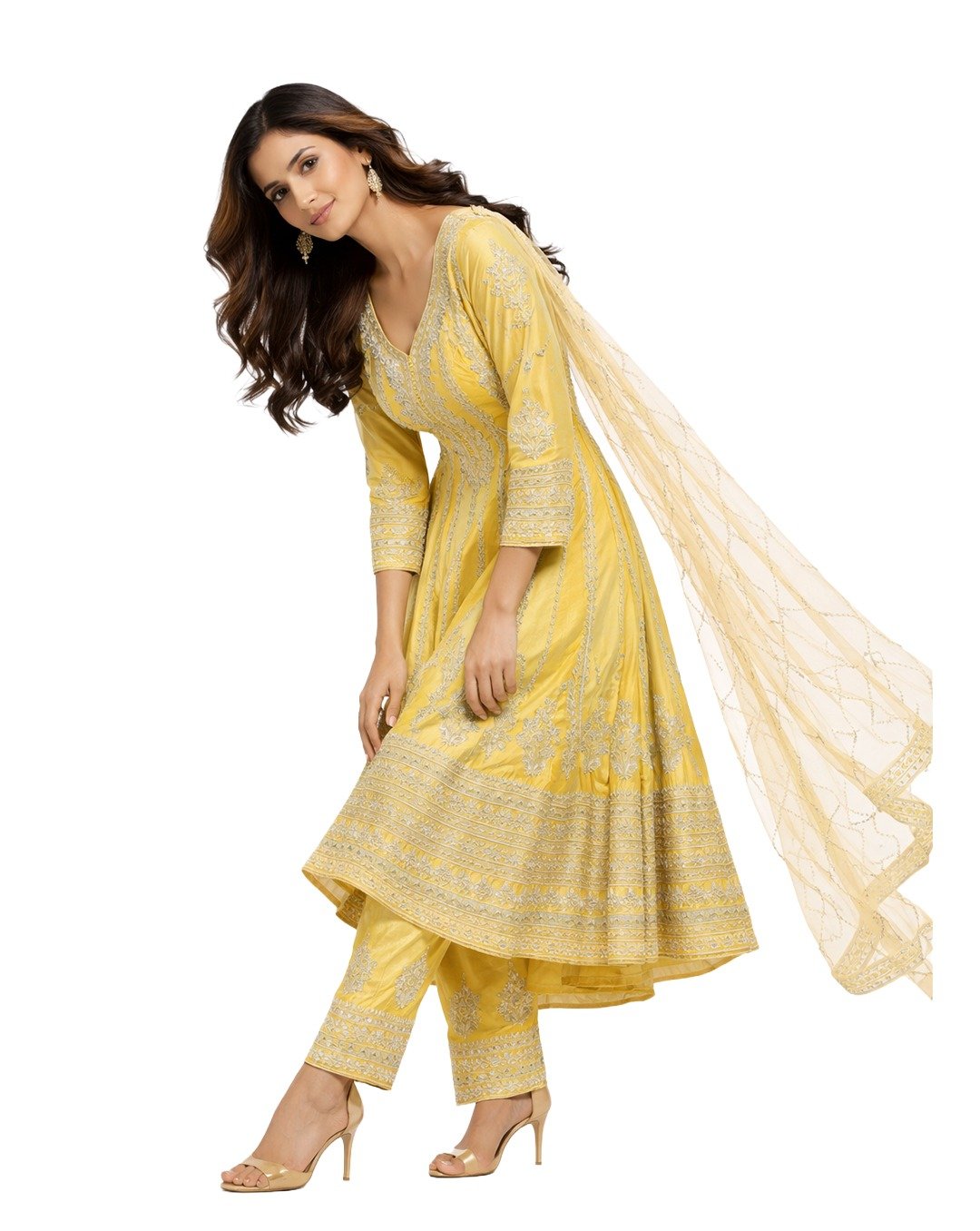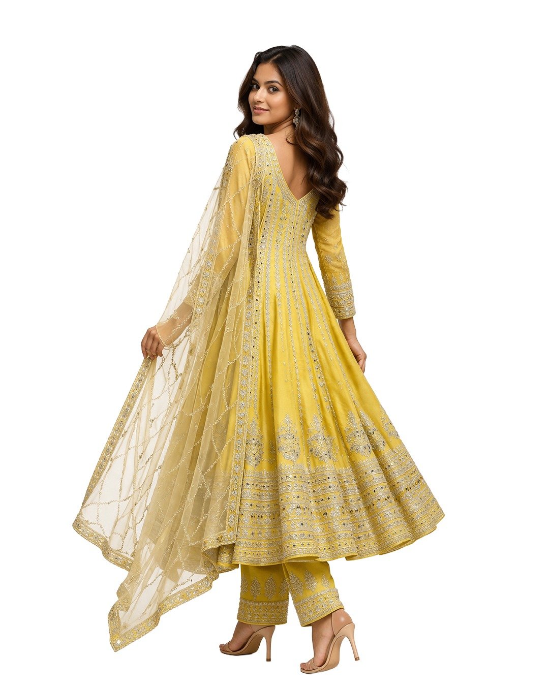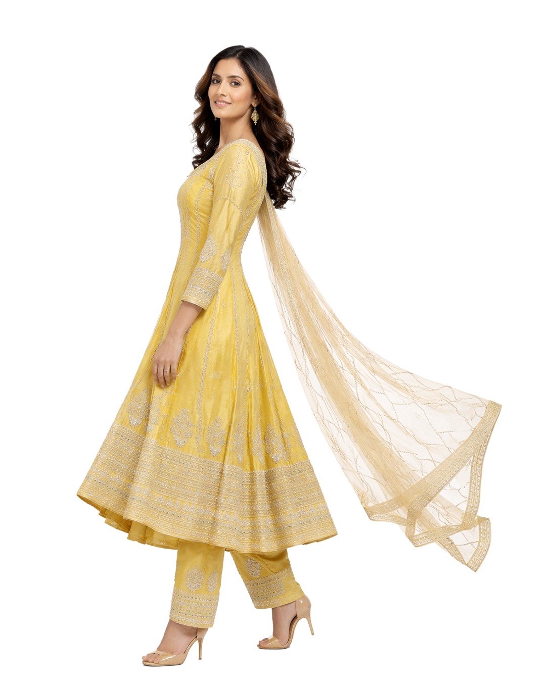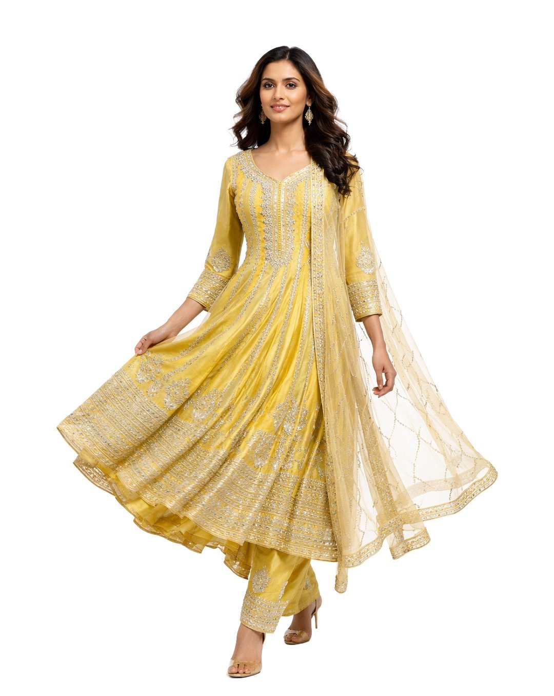 Yellow gold ensemble featuring gotta, patti, and mirror work, radiating festive richness, traditional charm, intricate detailing, and a vibrant celebratory appeal.