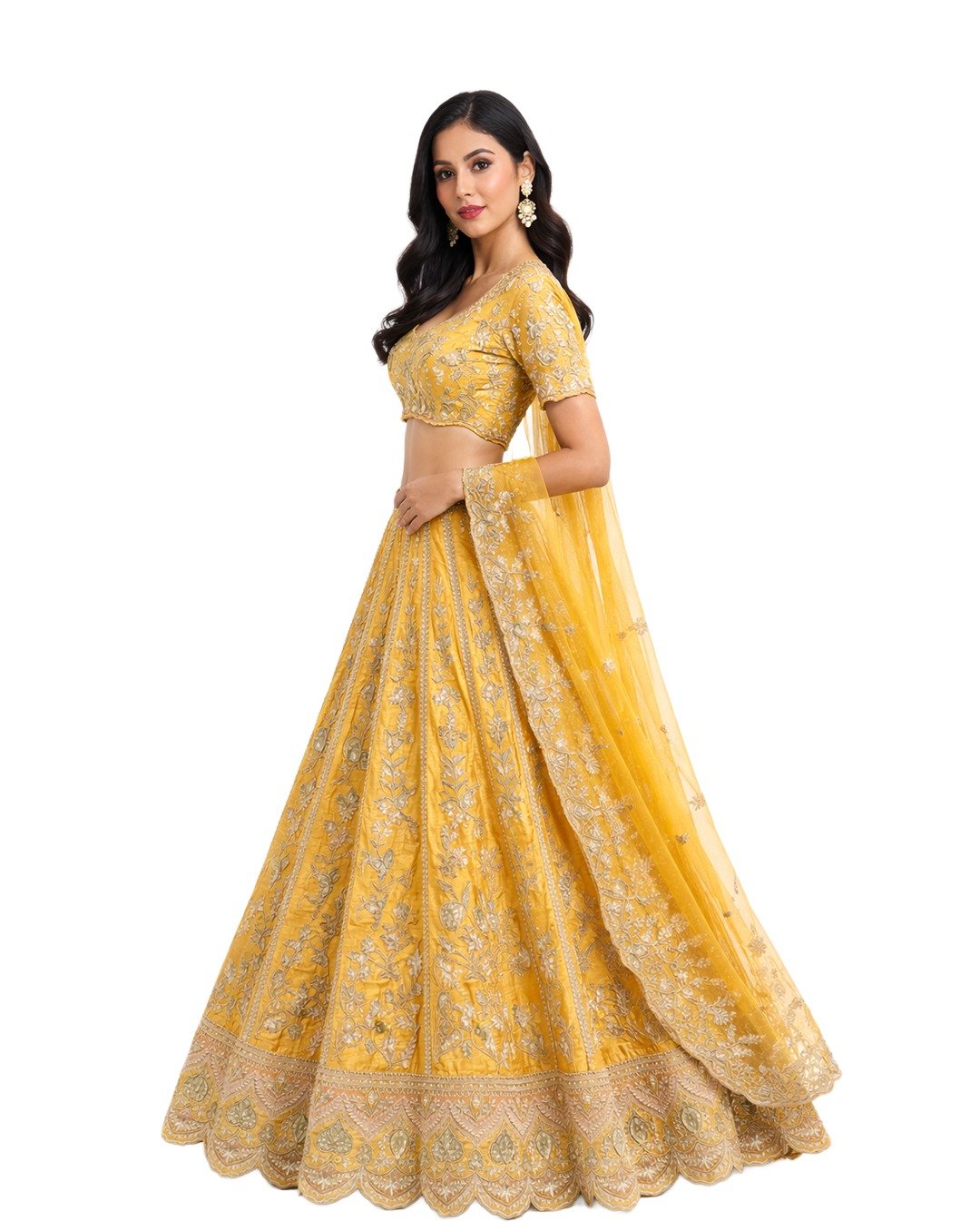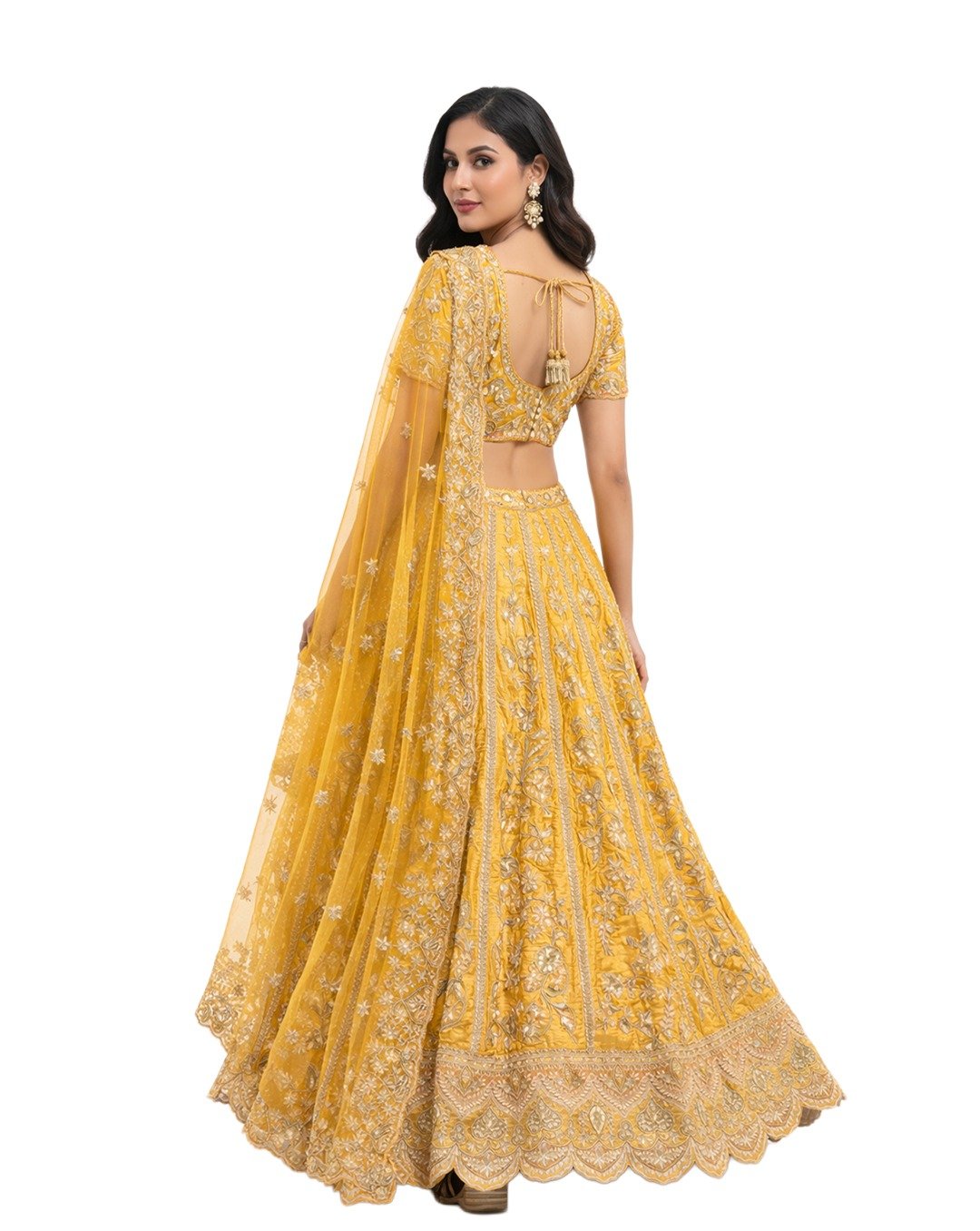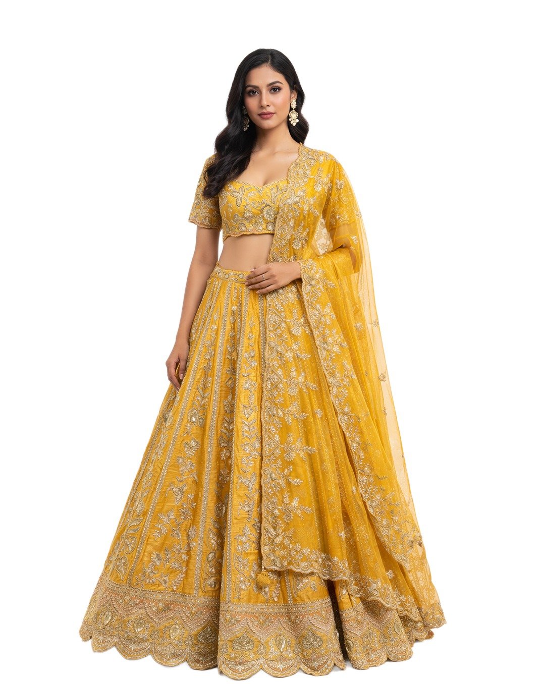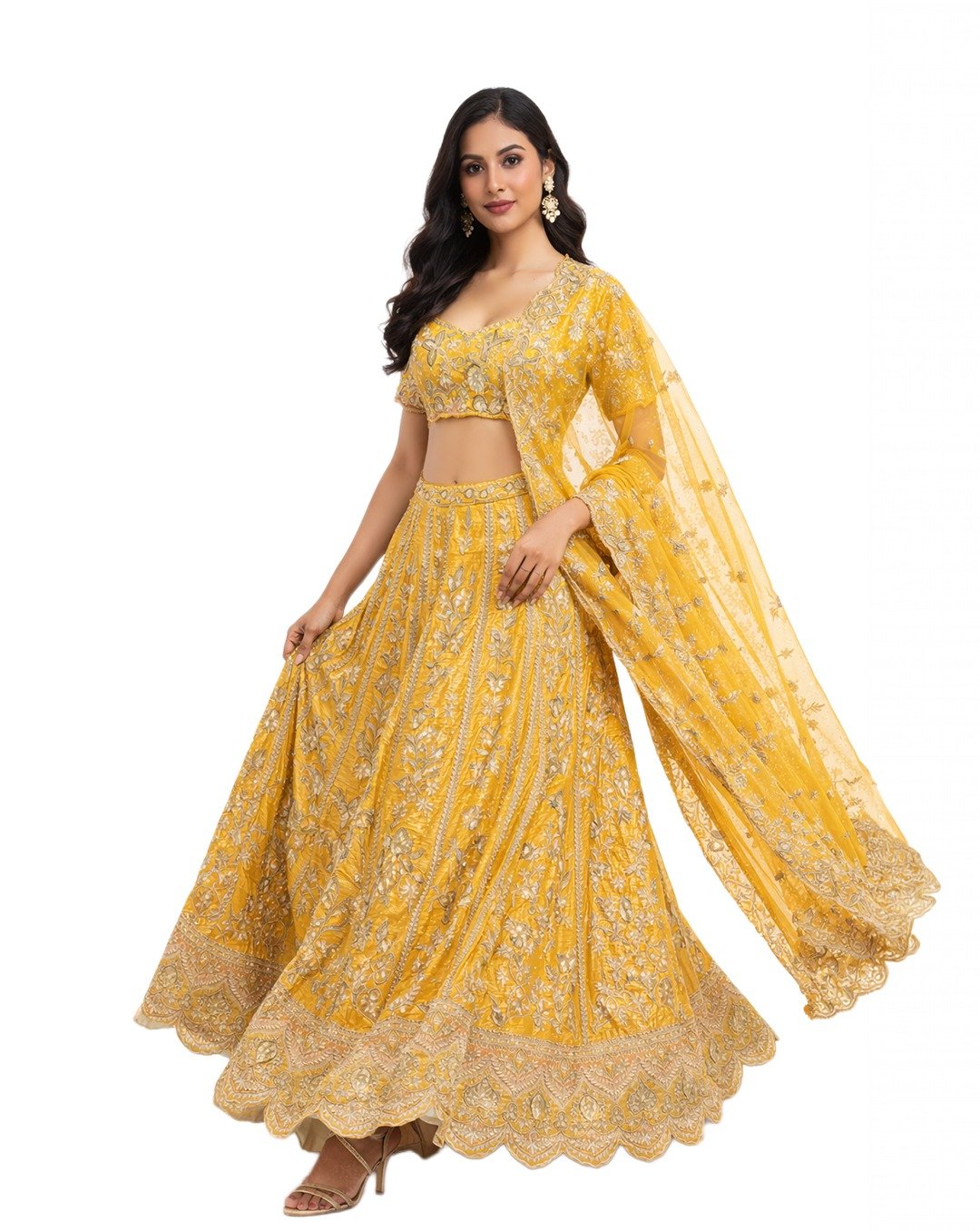 Yellow mustard outfit featuring gotta and patti work, showcasing vibrant tradition, intricate detailing, festive elegance, and a rich, timeless ethnic statement look.